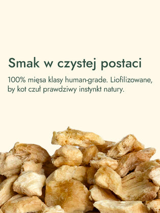 Filet z uda kurczaka to mięso o bogatszym smaku i wyższej zawartości zdrowych tłuszczów – źródła energii i aromatu, które koty tak bardzo cenią. Dzięki procesowi liofilizacji udało się zachować jego wartości w najczystszej postaci: 73,1% białka, naturalne tłuszcze oraz zestaw mikroelementów – fosfor, potas, sód, magnez, żelazo – a także pełen wachlarz witamin: A, C, D, E, K i z grupy B.